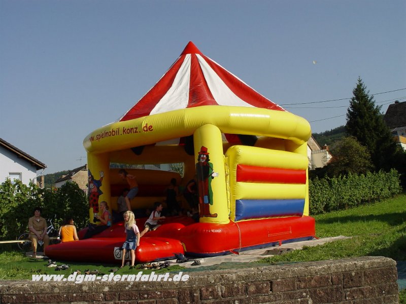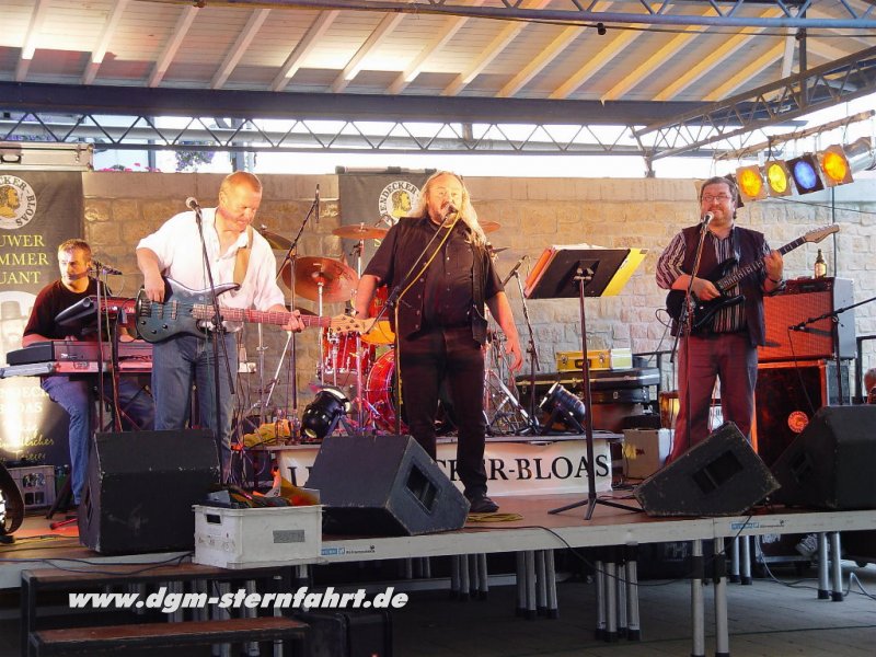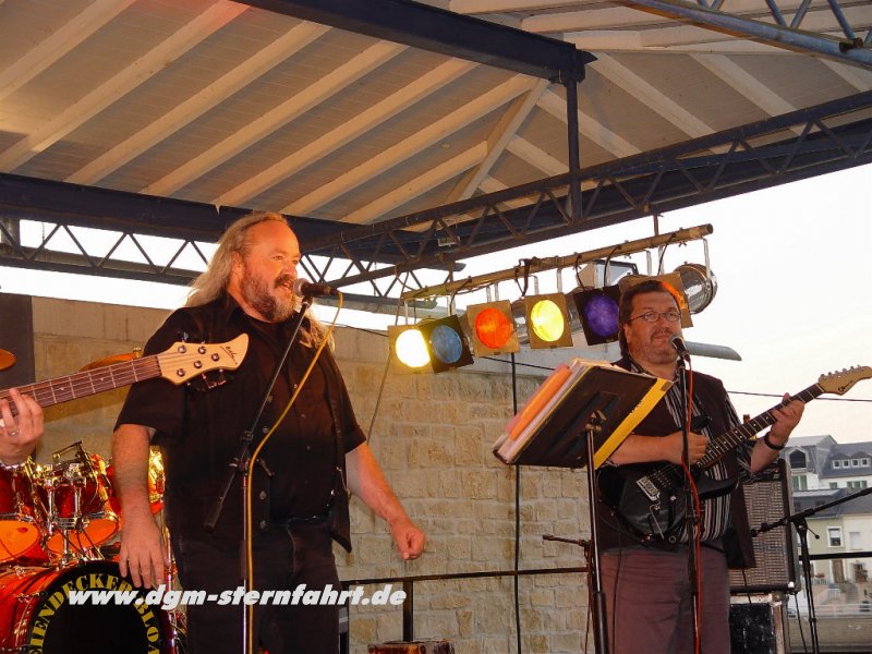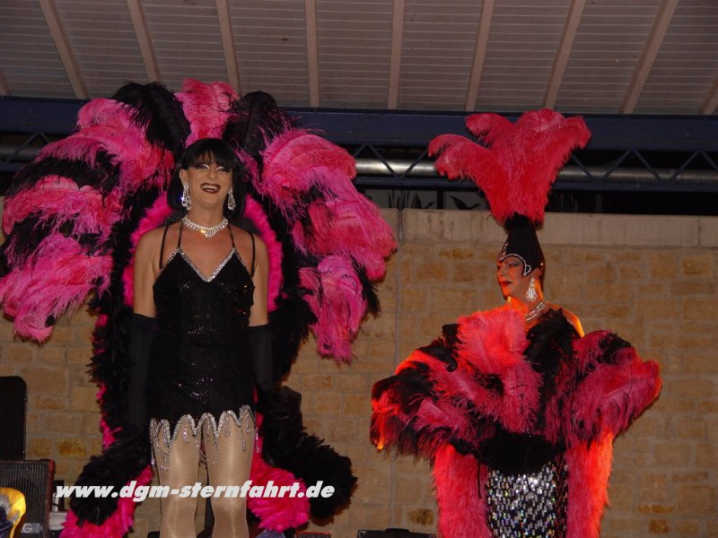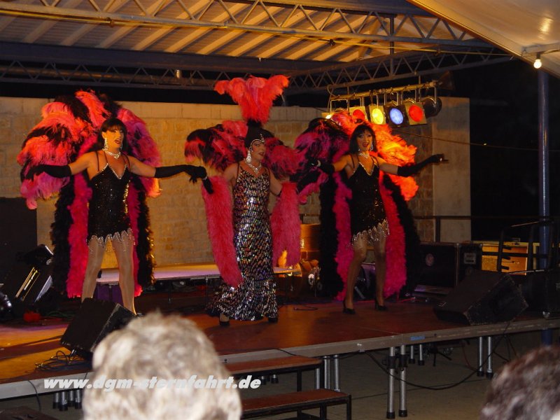 Als der Abbau der Instrumente erfolgte, nahmen vier junge Künstler fast unbemerkt Besitz von Oberbillig ein. Die “Fadas-Family”, die beste Travestiegruppe in Luxembourg und Trierer Land begann gegen 23.00 Uhr mit einer Show, die den anwesenden Gästen noch lange in Erinnerung bleiben sollte. Mit tollen Tanzeinlagen, fantastischer Mimik und wunderschönen Kostümen zogen Sie alle in Ihren Bann. Die Bühne wackelte bei dem tosenden Beifall, den es für beide Gruppen gab. Auch die “Fadas-Family” trat ohne einen Cent Gage auf an diesem Tag. Als dann “Wolli” aus Oberbillig (Mitglied der Unplugged Gang/Rockmusical “Behind the wall”) noch mit seiner Accoustik Gitarre auftrat und alte Rock-Klassiker gratis zum Besten gab -vielen Dank nochmal- fanden die musikalischen Darbietungen gegen 01.00 Uhr ein passendes Ende. Aber nicht die Partylaune der immer noch zahlreichen Gäste. Erst als wir um 04.30 Uhr den letzten Bierstand schlossen, war die 1.DGM-Sternfahrt 2004 beendet. Wir hoffen, daß es für euch alle ein unvergessliches Erlebnis bleiben wird.