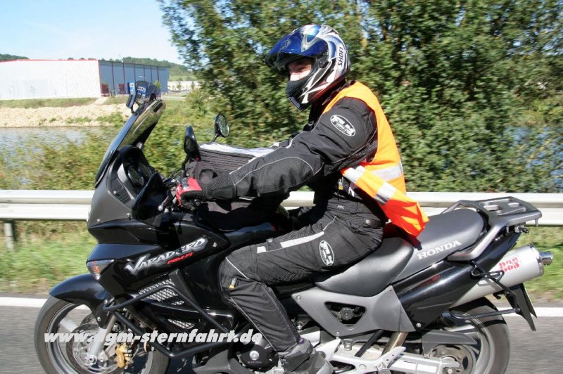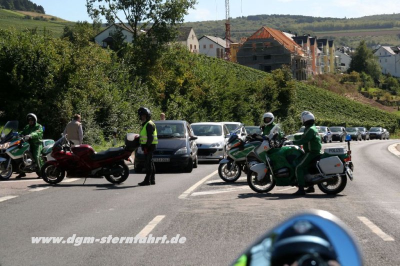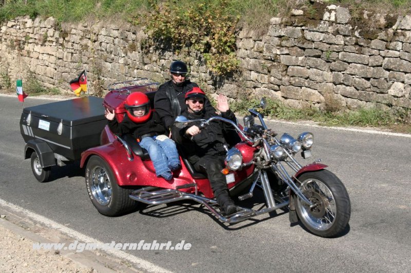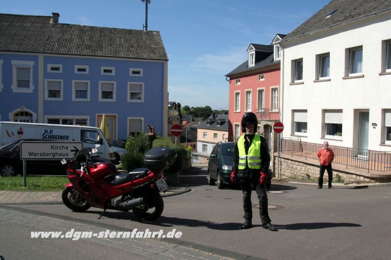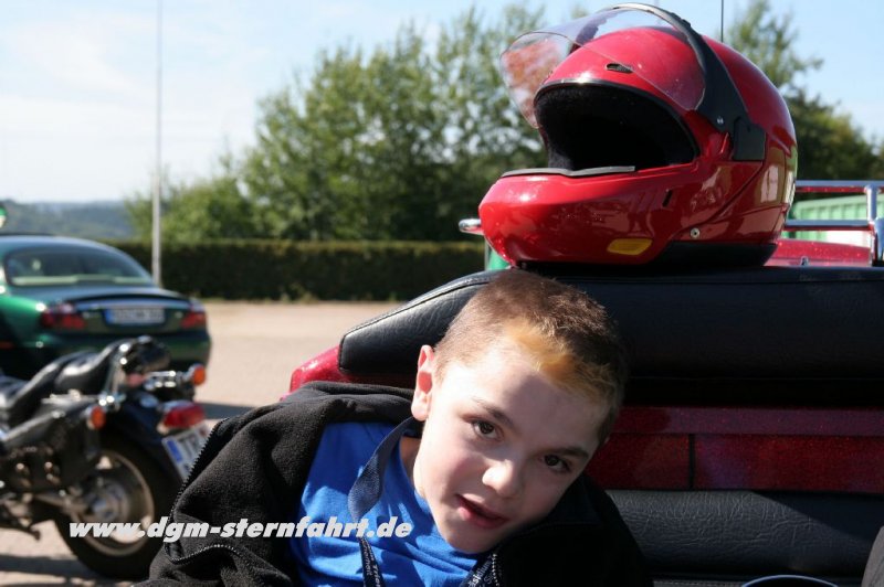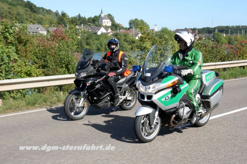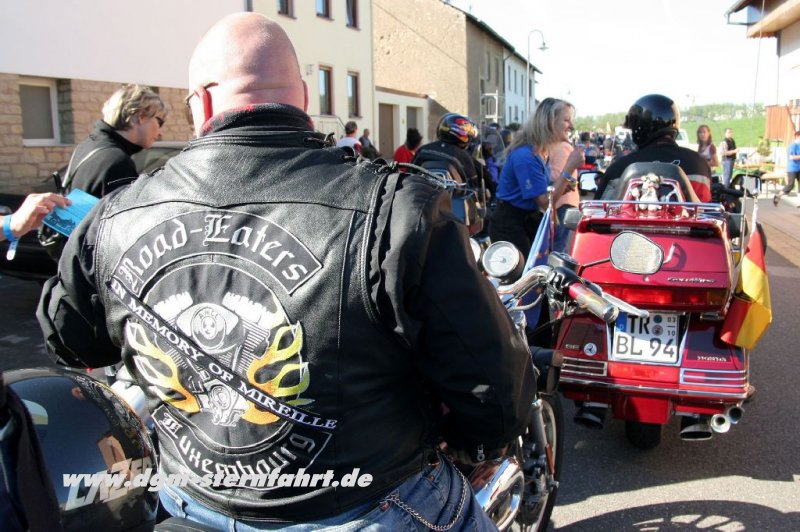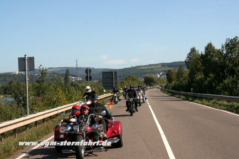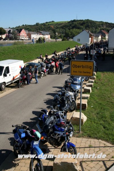 So gegen 9:00 Uhr trafen die ersten Motorräder in Oberbillig ein und es wurden von Stunde zu Stunde mehr, so dass man die geplante Ausfahrt, die gegen 11:00 Uhr stattfinden sollte, um eine Stunde verschieben musste. So gegen 12:00 Uhr war es dann soweit, der Convoy mit ca. 350 Bikes setzte sich, angeführt von Marius der die ganze Fahrt in einem Trike genoss, in Bewegung. Durch die Polizei-Motorradstaffel von Rheinland-Pfalz und einige private Regulatoren war die Verkehrssicherheit der Biker und auch der anderen Verkehrsteilnehmer hervorragend gesichert, so daß während der insgesamt 130 km langen Tour nichts schief ging. Der Polizeimotorradstaffel Trier und dem Polizeipräsident von Trier für die Begleitung und hervorragende Absicherung ein dickes Dankeschön. Unsere Sternfahrt-Tour führte über Nittel, Wincheringen ins Saarland nach Mettlach, wo wir eine Pause machten, über den Hochwald zurück nach Oberbillig.